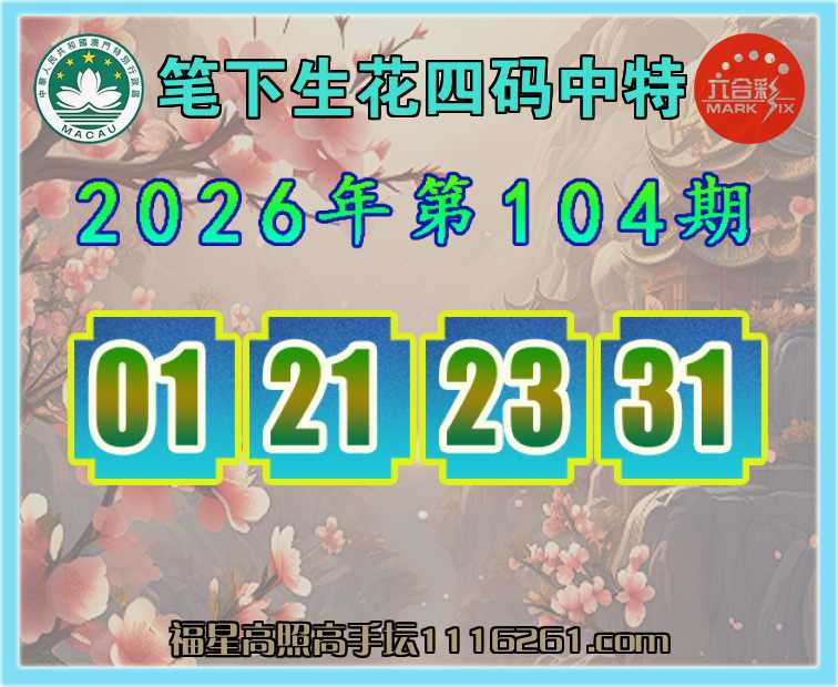 104期:【笔下生花】 👚四码中特👚【01.21.23.31】开:01