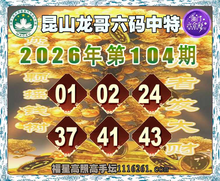 104期:《昆山龙哥》 🥠六码中特🥠【01.02.24.37.41.43】开:01